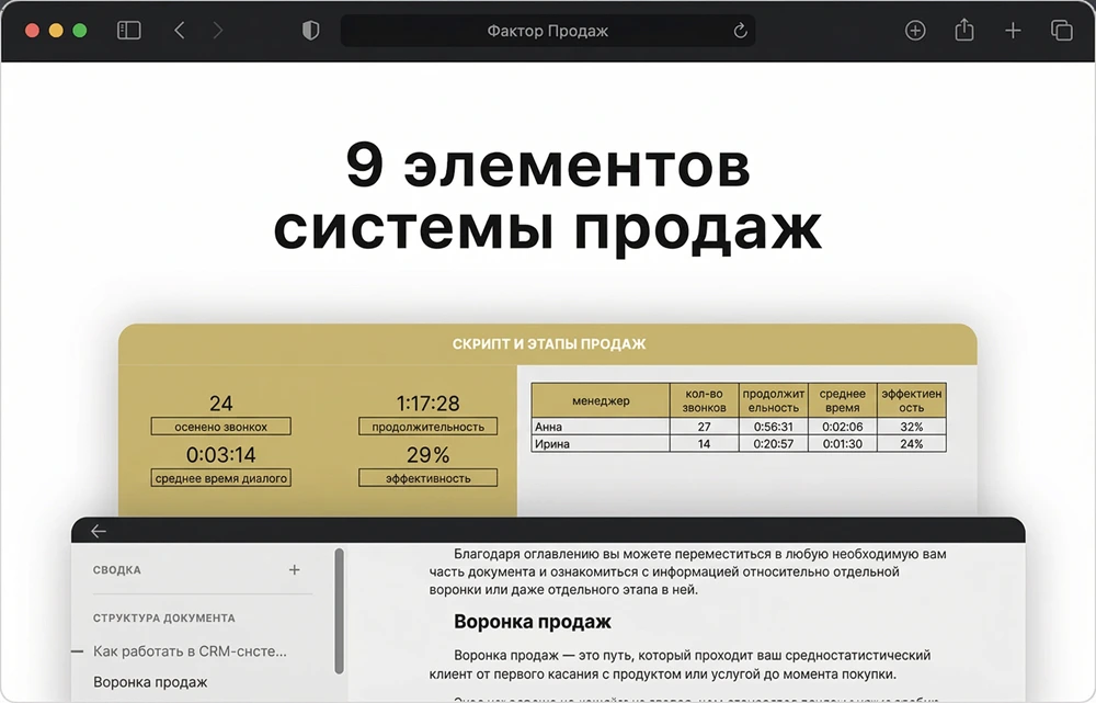 Соберем инструменты в единый механизм, где каждая шестеренка производит необходимый результат. В отделе продаж появится четкий порядок действий, которые повышают конверсию в продажу