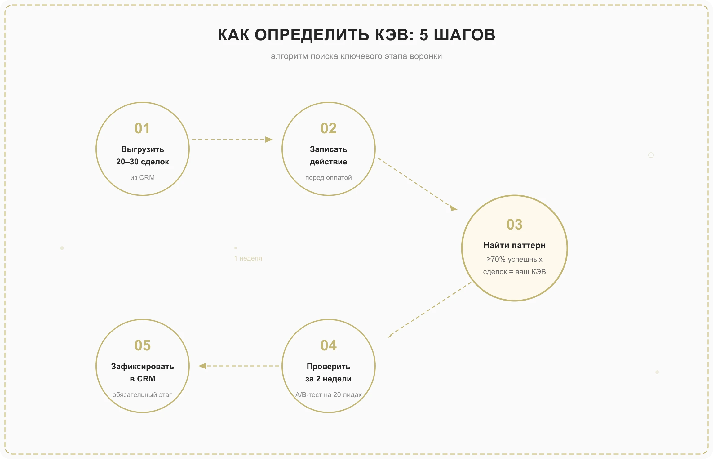 КЭВ можно внедрить за неделю: определить за 5 шагов, зафиксировать в CRM, замерить конверсию. Через 2 недели у вас будут цифры, которые покажут, работает ли выбранный этап.