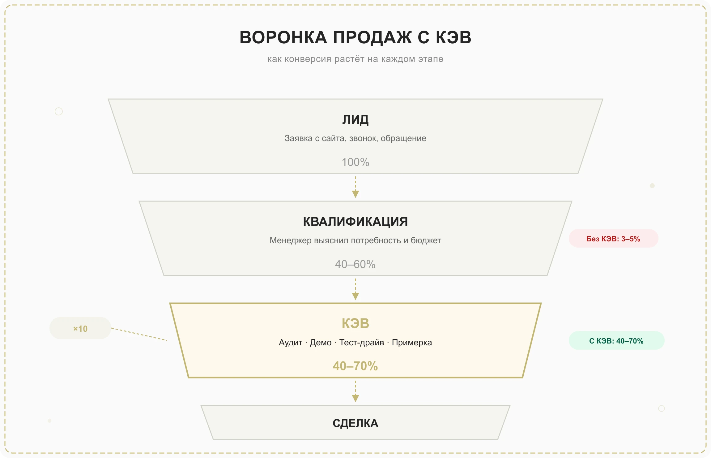 Разница между «отправить КП по почте» и «провести диагностику лично» — 10 раз по конверсии. Вся воронка строится вокруг одной задачи: довести клиента до КЭВ.